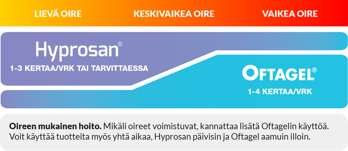 Hyprosan-silmätipat ovat kätevä apu lieviin oireisiin. Mikäli oireet voimistuvat, kannattaa lisätä Oftagelin käyttöä. Voit käyttää tuotteita myös yhtä aikaa, Hyprosan päivisin ja Oftagel aamuin illoin.